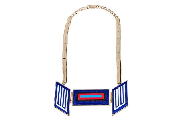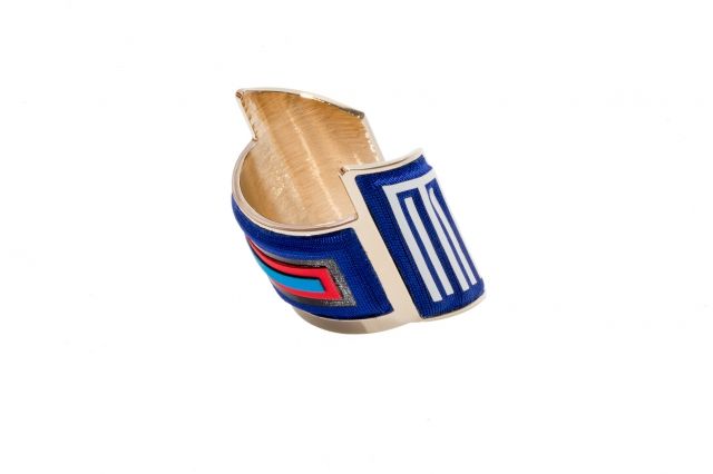 Come la Capsule Wallframe: una serie di gioielli liberamenti ispirati ai lavori di Sol LeWitt e realizzati con la tecnica della temocollatura. Questo tipo di lavorazione permette alla maglia stessa di essere allo stesso livello del metallo e quindi di avere una superficie piana riflettente interrotta da pezzi di maglia colorata. Questo crea giochi di specchi e riflessi che richiamano alla mente gli intarsi degli artigiani indiani.