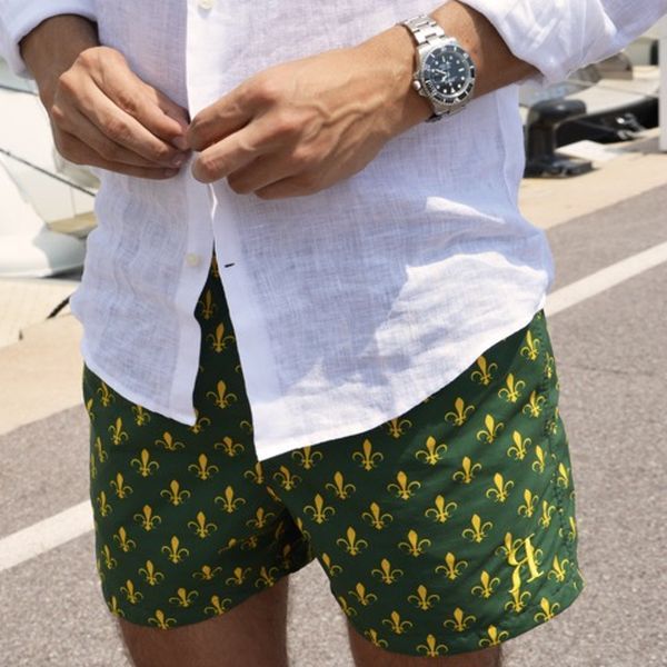 La linea si declina proprio in quattro fantasie raffinate, dedicate alle spiagge più esclusive: righe bianche e blu per il modello Santorini, omaggio alle sue abitazioni candide riflesse nel blu del mare più profondo; stemmi blasonati per la fantasia di Elba con un pattern di gigli reali su una base verde cupo; azzurro mediterraneo per Capri, dal delicato pattern floreale; bordeaux acceso per Montecarlo, la variante a tinta unita dedicata al lusso patinato del principato.