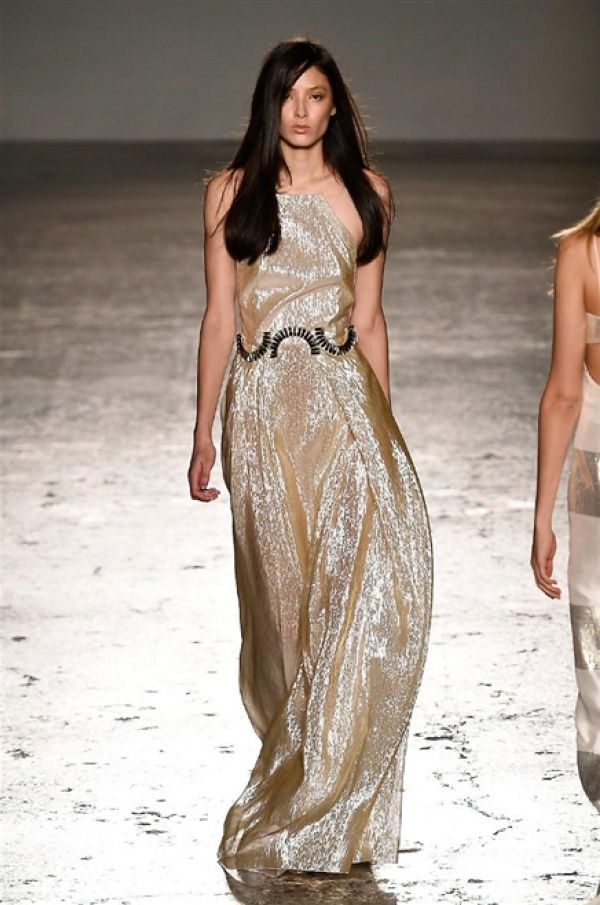Le linee sono rigorosamente geometriche, le silhouette precise descritte attraverso tuniche che lasciano scoperte le spalle, dove il tocco grafico è dato dagli inserti in maglia. La maglieria è leggerissima declinata nei colori dell´oro e dell´argento. Il deco´ si fa più evidente degli abiti fil coupè con le grafiche ispirate alle opere di Sonia Delaunay.