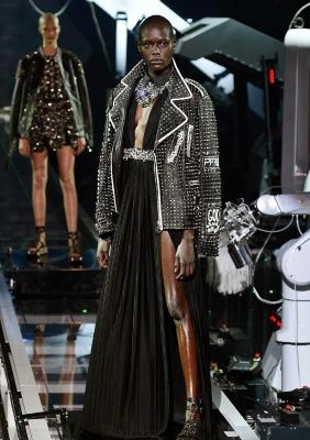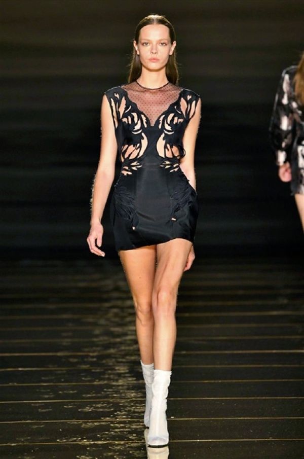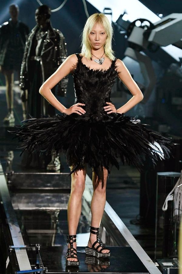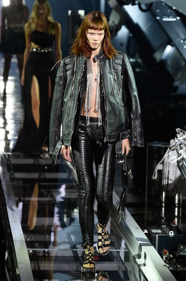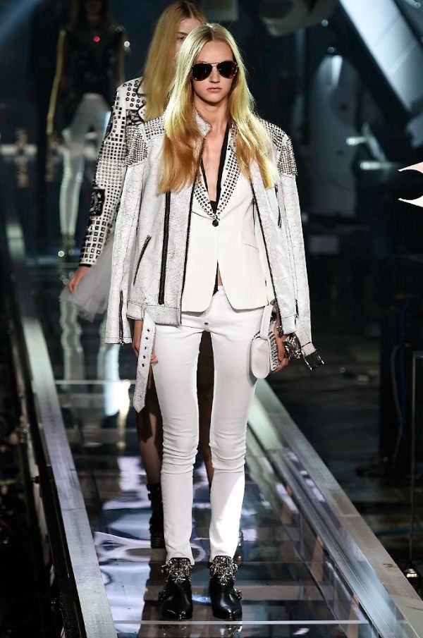 La collezione si concentra tutta su un grafico bianco e nero che dà vita a uno stile a metà strada tra cultura hiphop e rock. La musa di Plein è una guerriera metropolitana che gioca con pantaloni con coulisse in vita ma di pelle, cappe a trapezio di vernice luccicante. Non ha paura di accostare i pantaloni pelle con le pellicce più lussuose, l’abito da cocktail di lamé con i boot borchiati. E la sera? lunghi abiti affusolati dotati di audaci oblò sulla pelle nuda e spacchi abissali